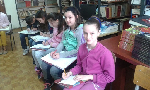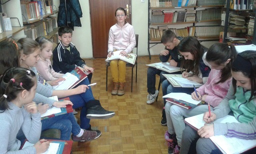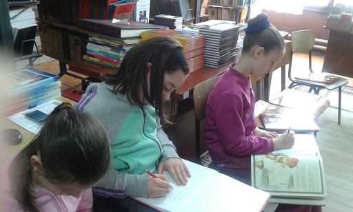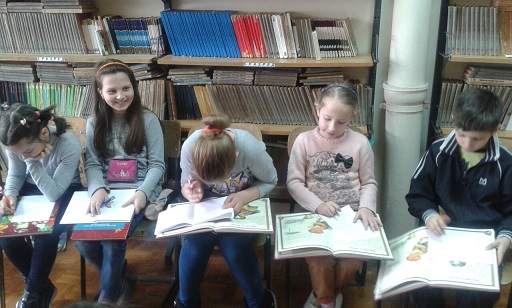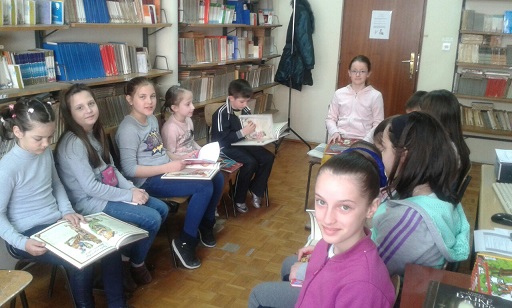 Драго нам је што имамо ученике који радо проводе вријеме у библиотеци, па су се тако и данас 2.4. 2015., дружили са књигом. Наиме, са задовољством су се упознали са новим, недавно набављеним, књигама. При томе су активно учествовали у читању и анализи Лафонтенове басне “Мајмун и мачак“. На крају су урадили илустрацију при чему су показали велику маштовитост.
