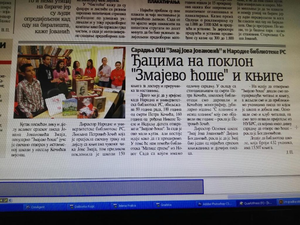 У Недјељи дјетета, 4.10.2016. је у нашој школи отворено „Змајево ћоше“, дио библиотеке у којем су смјештене књиге великог писца по коме наша школа носи име. Поред књига ту је и велики портрет Змај Јове Јовановића, дјело наше наставнице ликовне културе Свјетлане Лазић, академског сликара, затим пано под називом Змај Јова Јовановић – сегменти из живота и стваралаштва, и још неки детаљи везани за овог важног књижевника и дјечијег писца. Приликом отварања „Змајевог ћошета“, црвену траку је пресјекла директор Народне и универзитетске библиотеке Републике Српске, Љиљана Петровић Зечић. Том приликом нам је уручен поклон од 150 књига школске лектире и договорена је даљна сарадња наше двије библиотеке. Отварање је медијски испраћено од: РТРС, АТВ, ЕЛТА, а и Гласа српског. Том приликом је најављено отварање читалачког клуба, чији је рад на овај начин озваничен.