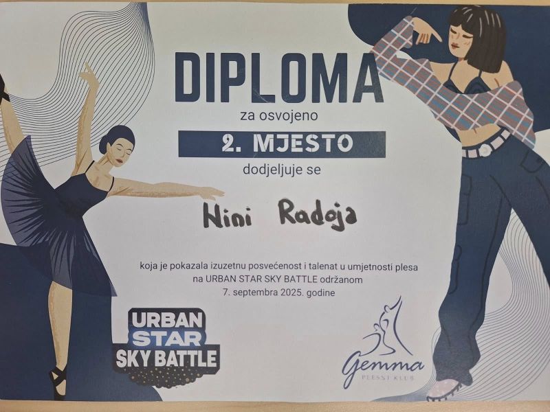 Наша ученица Нина Радоја остварила је сјајан резултат освојивши 2. мјесто на такмичењу у плесу, познатом по називу Urban Star Sky Battle.
